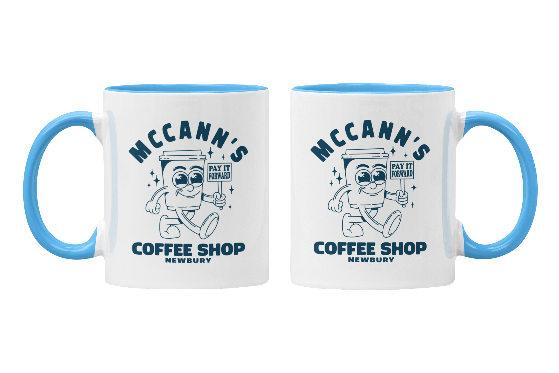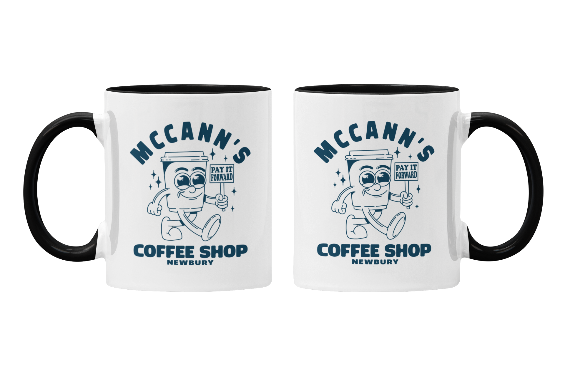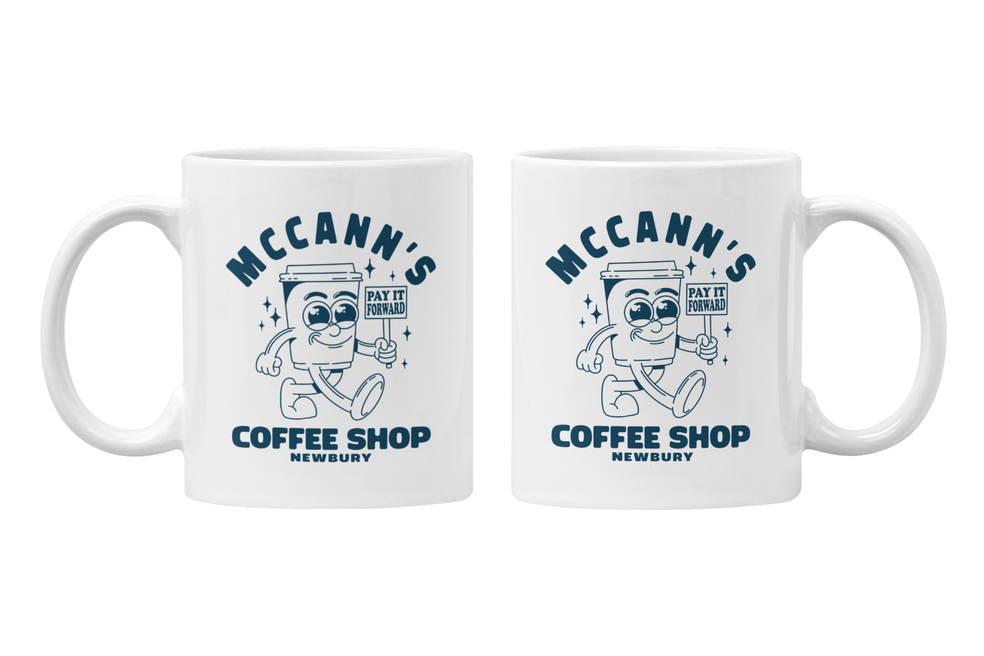 Get your day started on the right foot with the "Meals with Max - McCann's Coffee Shop" Mug. This coffee mug features a retro cartoon style character of a coffee cup, the logo of McCann's coffee shop in Newbury. It's the perfect addition to your morning routine or a great gift for any coffee lover!