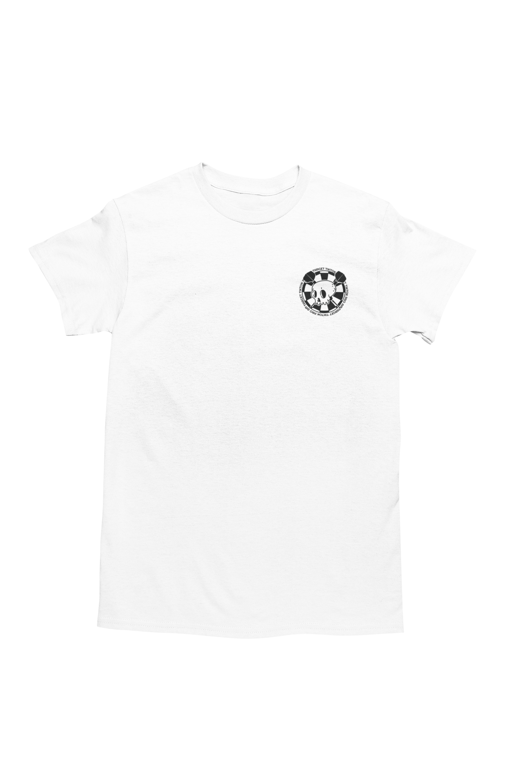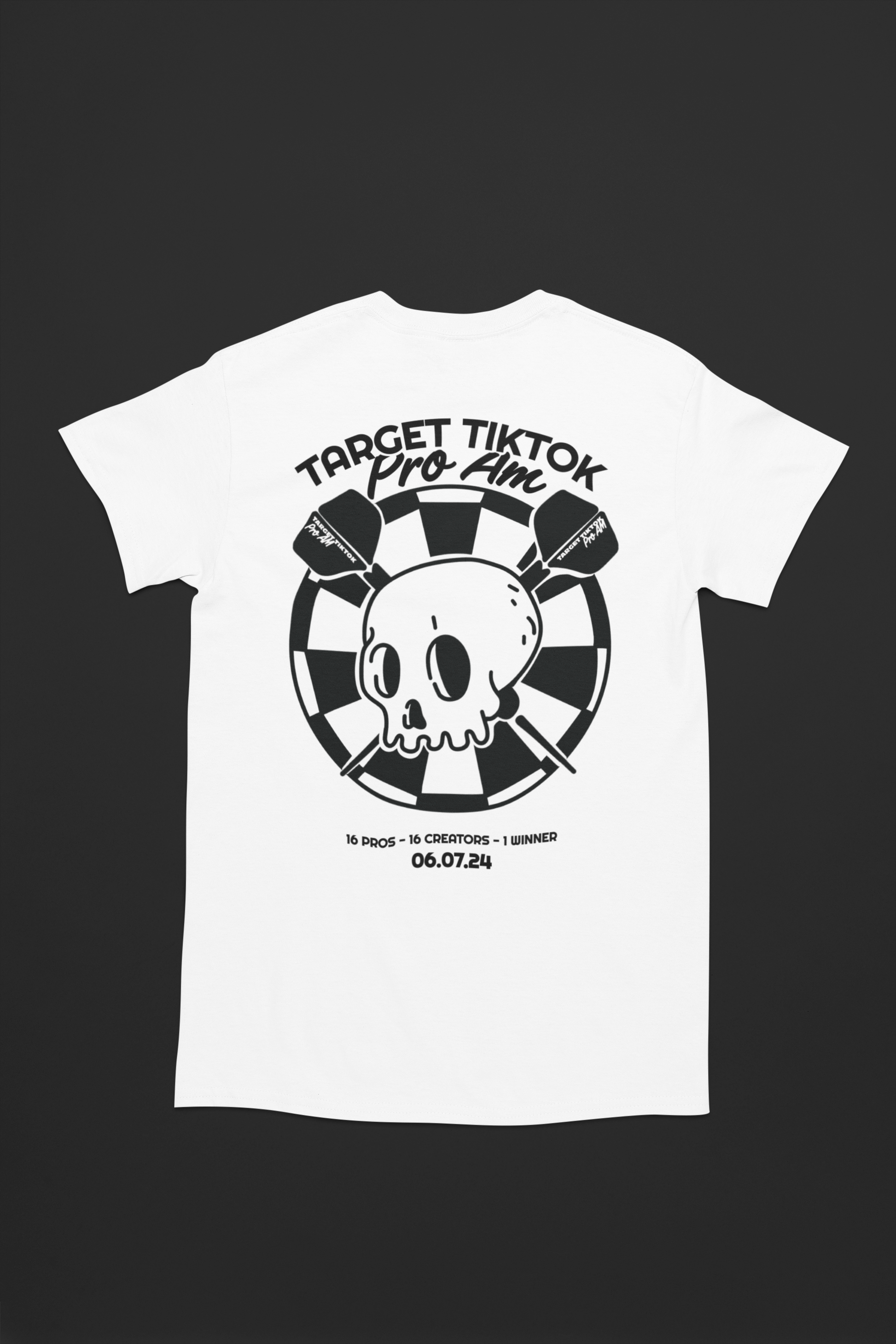 Represent your love for darts with the Target TikTok Pro AM Tee Shirt, official merch of the Target TikTok Pro AM tournament. This design features a skull and crossed darts on the board with the details of the event underneath. This light-weight tee made from 100% cotton, offering both style and comfort for any occasion.